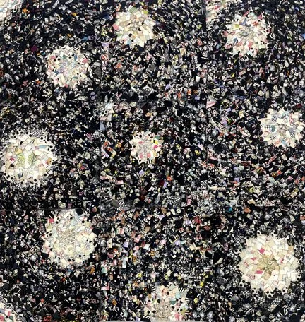 My ongoing love of quilts and exploring the use of found and repurposed fabric has led me to examine and connect to the technique of the Alabama Pine Burr quilts. I am fascinated by how the attention to creating a field of cohesion, depth and movement can be achieved by unifying these small squares around a central medallion. As I worked on this piece the sense of the night sky, the universe and the Cosmos emerged.