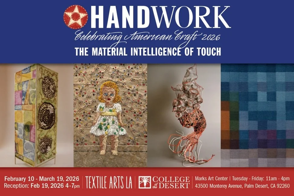 “The hand is our first language. Every gesture in textile work—pulling thread, weaving cloth, tying knots—holds a kind of thinking. Inspired by Ann Hamilton’s idea of the ‘sewing hand,’ this exhibition invites us to see how making by hand is an act of attention and connection. The artists of Textile Arts LA remind us that the handmade is not a relic of the past but a living dialogue between body, material, and community.” — [Carrie Burckle], Curator, Handwork: The Material Intelligence of Touch